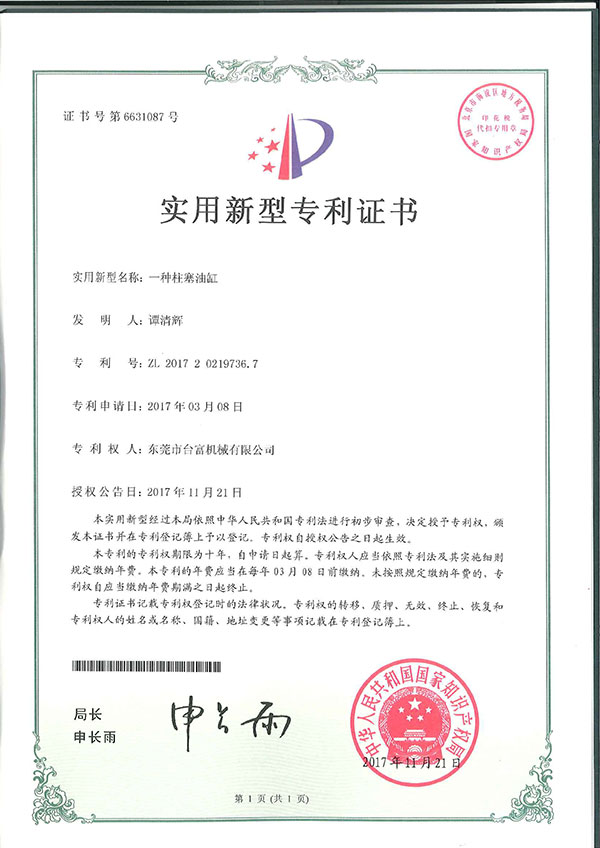 一種柱塞油缸專利證書